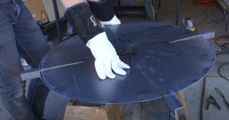 На следующем этапе болгаркой вырезаем в каркасе спутниковой тарелки центральную часть. Вместо нее нужно будет установить круглую металлическую пластину, дополнительно усиленную уголками с нижней стороны.