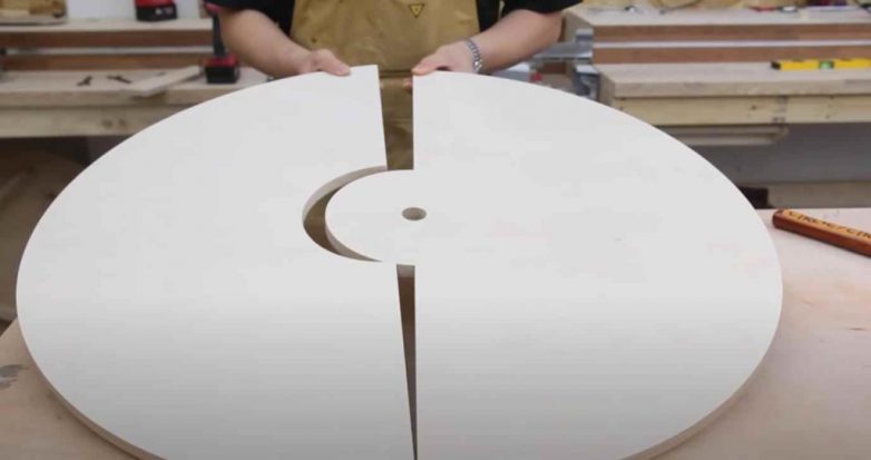 Сначала необходимо будет определиться с размерами столика. После этого из листа фанеры толщиной 20 мм вырезаем круг.Дальше при помощи электролобзика его нужно распилить на две части, как показано на фото ниже.
