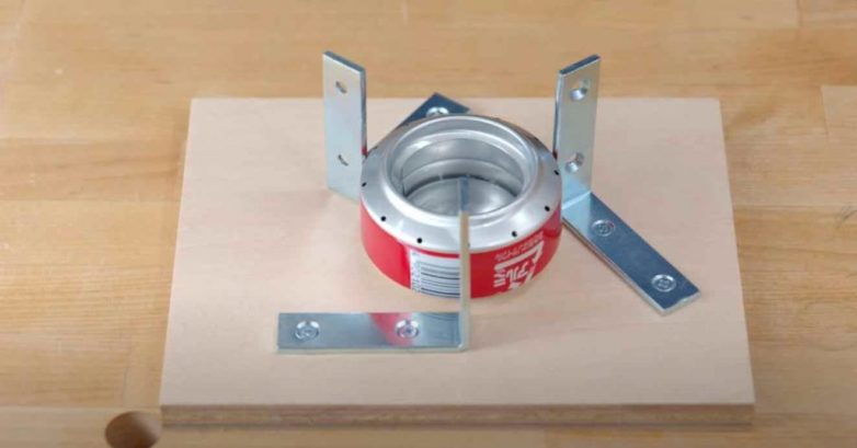 В емкость для топлива наливаем спирт. Устанавливаем спиртовую горелку на самодельную подставку, на которой закреплены мебельные уголки — опоры для посуды.