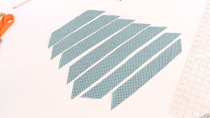 Сшейте полоски в одну длинную и сделайте из неё косую бейку с помощью специального приспособления, либо одним из способов, описание которых легко найти в сети.