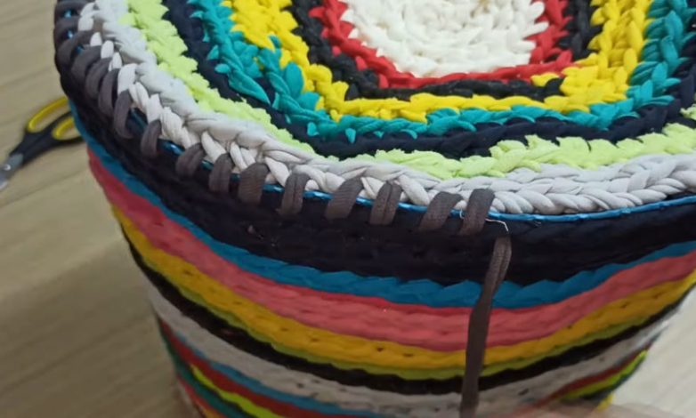 Используя остатки трикотажной пряжи, свяжите основание корзины.