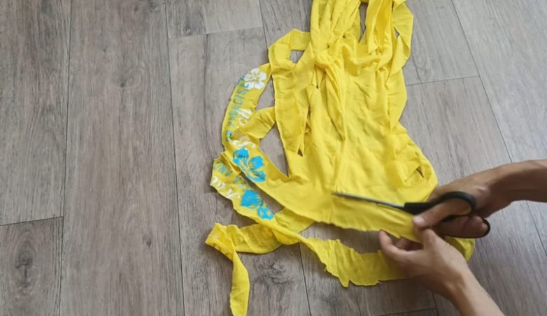 Разрежьте трикотажные футболки на полосы шириной 3 см, не доходя до края примерно на 5-6 см. Обрежьте лишние части футболки и расправьте заготовку.