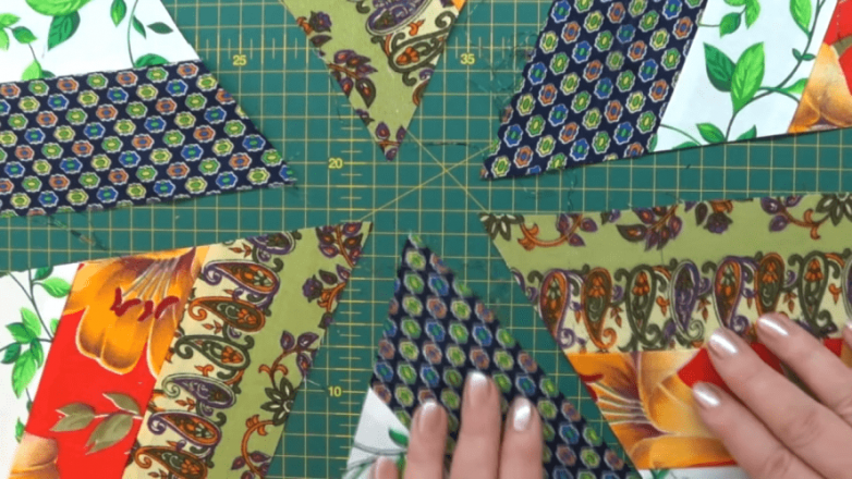 Сострачиваем между собой пары треугольников, затем совмещаем ромбы и снова сострачиваем, двигаясь от средины к краю.