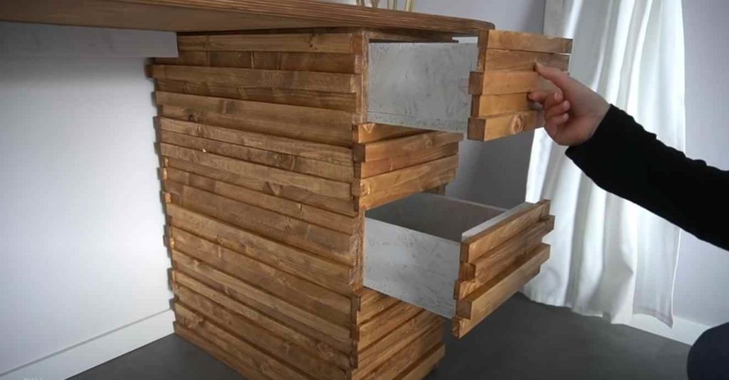 Наружная поверхность тумбы и фасады выдвижных ящиков автор решил «обшить» деревянными рейками. Получилось оригинально и необычно.