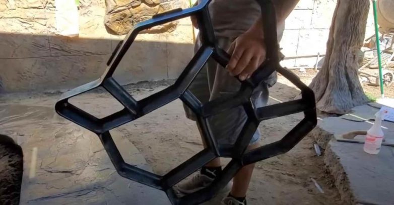 После этого с помощью пластиковой формы для бетона необходимо будет «разбить» всю поверхность дорожки на отдельные участки — «камушки».
