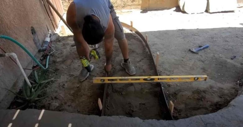 Первым делом определяемся с шириной и длиной дорожки, после чего устанавливаем опалубку. Фиксируем ее с помощью деревянных колышков.
