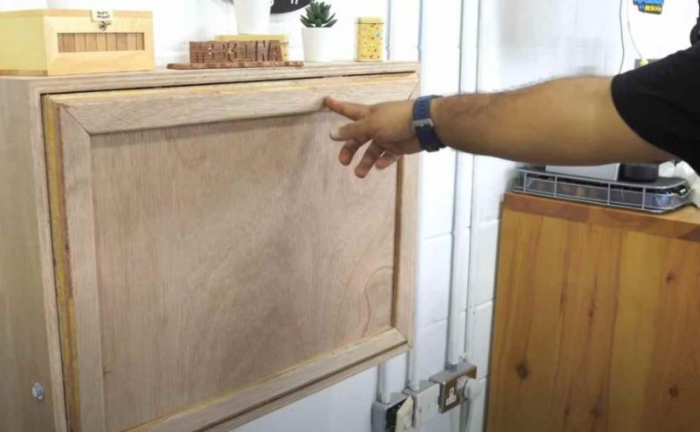 Основной материал — фанера. Толщины листа в 18-20 мм будет более чем достаточно. Отпиливаем заготовки требуемого размера.Первым делом собираем корпус шкафчика. Ничего сложного — обычный прямоугольный короб.