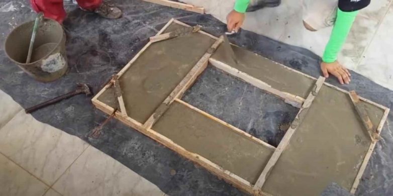 На следующем этапе необходимо будет приготовить раствор из цемента, песка и воды. Укладываем раствор в опалубку. Верхний слой приглаживаем гладилкой. Оставляем до застывания бетона.