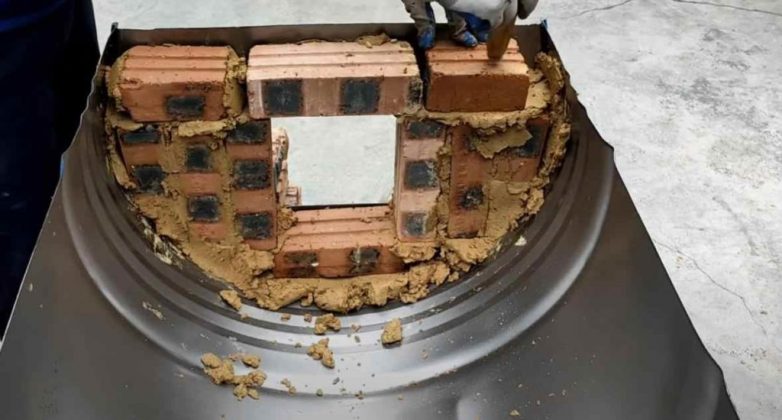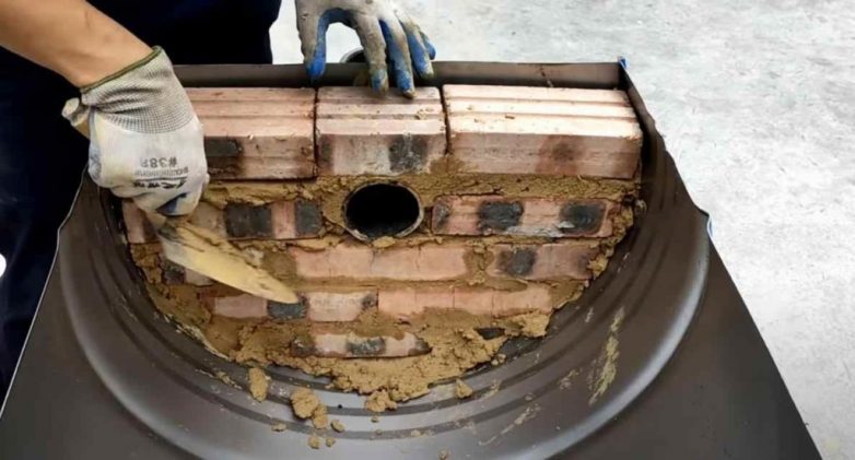 В очаге с одного торца вырезается прямоугольный проем для закладки дров (размер — 20х18 см), а с другой — отверстие под дымоход.