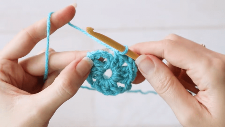Дальше все продолжается без изменения мотива и последовательности: цепочка из 5 ВП, *3ССН, 2ВП*2ССН,1ПС. При этом группа столбиков провязывается под ВП предыдущего ряда, а ВП делаются над группой ССН предыдущего ряда. С каждым рядом количество «веерков», состоящих из ССН, увеличивается. Квадрат становится все больше.