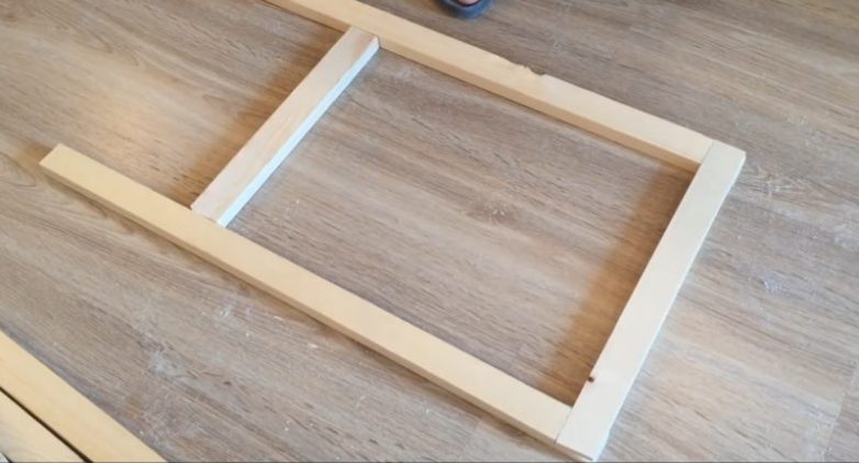Во всех подготовленных рейках подготовьте отверстия для саморезов. Соедините рейки между собой, чтобы получить основание стеллажа.
