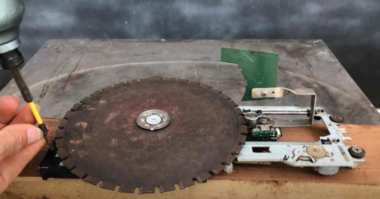 Процесс изготовления самодельного приспособленияАвтор разобрал жесткий диск от компьютера, удалил магниты и сам диск. Вместо диска он установил диск для циркулярной пилы.