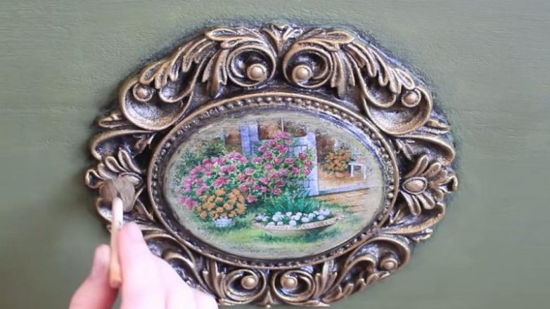 Покрыть всё краской и лаком. Декор можно покрыть коричневым воском и золотой акриловой краской.