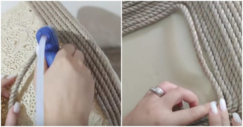 Затем берем полоску любой подходящей ткани, например, мешковины и оформляем с ее помощью срезанный край — просто приклеиваем ее по всему периметру.