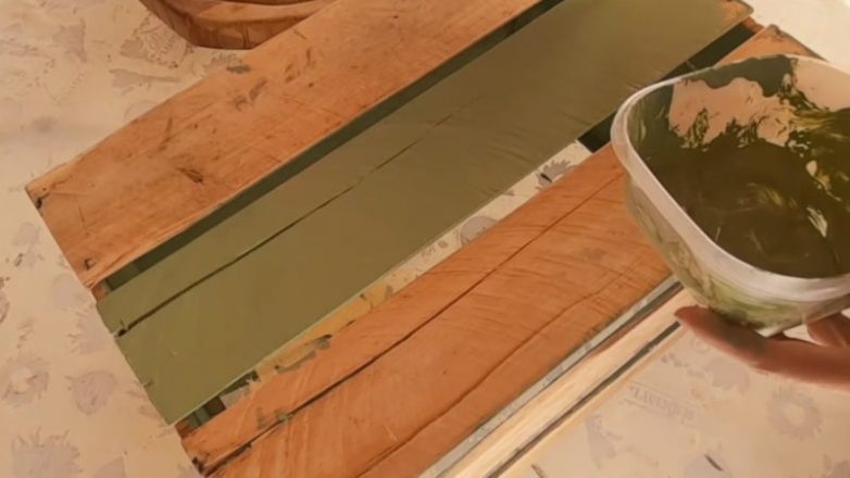 Из деревянных брусков соберите подставки для ящика и покрасьте их в оливковый цвет.