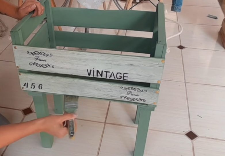 После полного высыхания этого слоя краски нанесите на внешнюю поверхность краску бежевого цвета. После того, как бежевая краска высохнет, используя нож, аккуратно счистите небольшое количество краски, не бойтесь оставлять царапины. Это позволит эффектно состарить ящик.