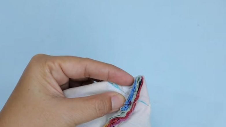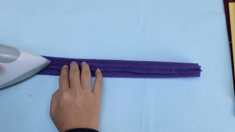 Сложить вдоль пополам, прошить край на машинке. Все прошитые лоскуты разутюжить по линии шва.