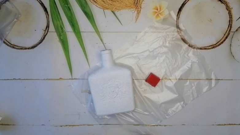 У бутылки удалить все этикетки, обезжирить поверхность. Нанести акриловый грунт губкой.