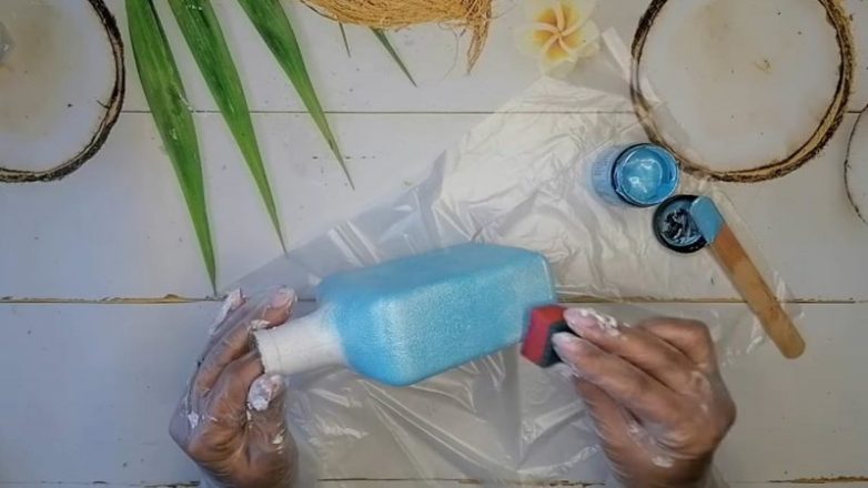 Когда грунт просохнет, нанести голубую акриловую краску. После этого покрыть бутылку матовым лаком.