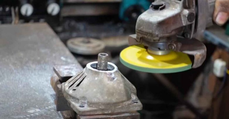 Зажимаем деталь в слесарных тисках, и с помощью болгарки отрезаем длинную часть. Лепестковым кругом зачищаем края в месте реза.