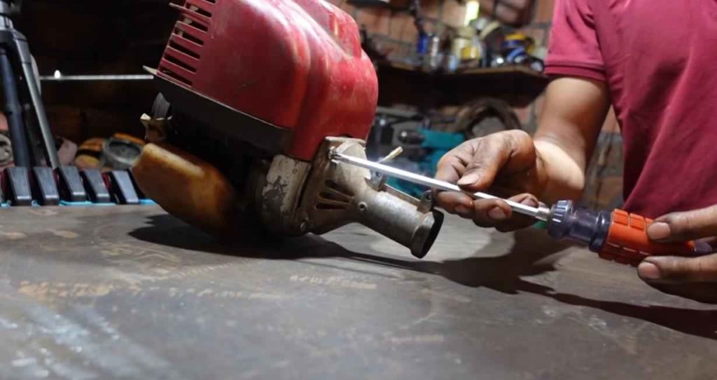 Первым делом необходимо открутить часть корпуса бензокосилки, в которую вставляется штанга.