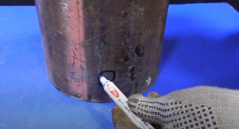 В качестве корпуса печи используется стальная круглая труба диаметром 220 мм (длина заготовки — примерно 35-40 см). По бокам привариваем ручки.