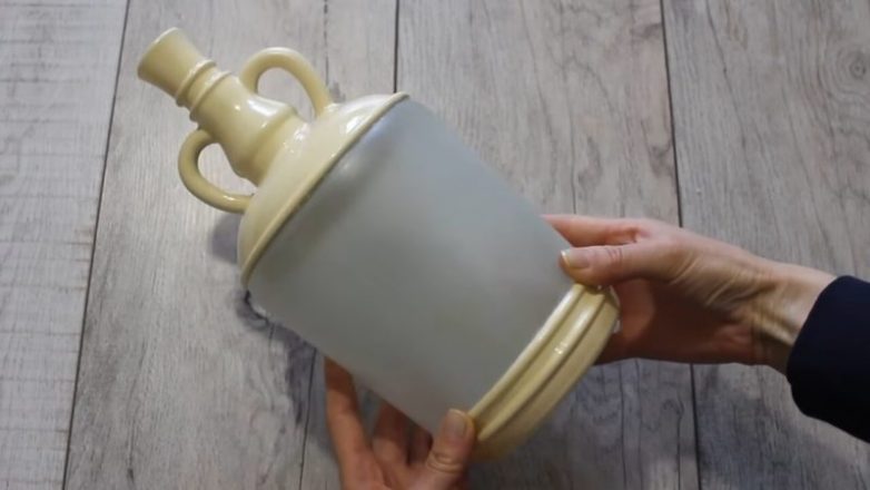 Серединку бутылки заклеить малярным скотчем, покрасить низ и верх. Когда краска высохнет, заклеить, в свою очередь, низ и верх, а по центру нанести краску с эффектом матового полупрозрачного стекла (например).