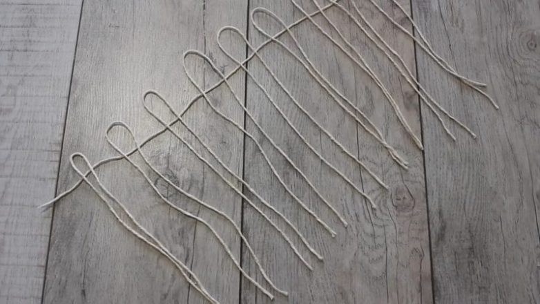 Верёвку нарезать и разложить, как показано на фото ниже.