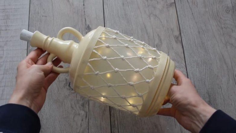 Внутрь также поместить светодиодную гирлянду на батарейках. Ещё одна идея оригинального и красивого светильника для дома из бутылки!