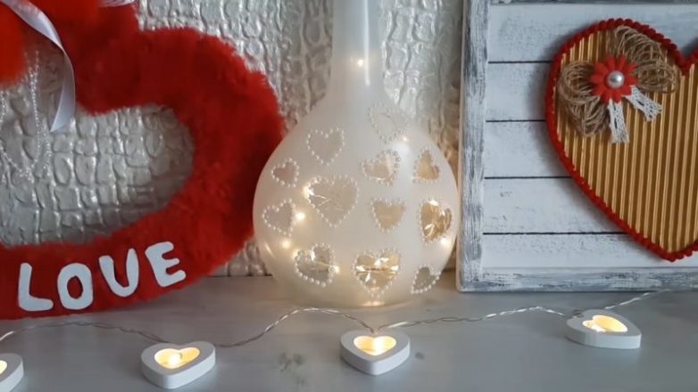 Приклеить сердечки, вырезанные из малярного скотча. Можно сделать и любой другой узор по желанию. После приклеивания сердечек, покрасить бутылку. Снять малярный скотч. По ободку сердец приклеить бусины.