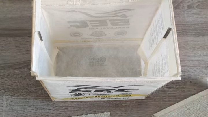 Шьём из материи (в данном случае использовалось небелёное грубое полотно, наподобие двунитки) внутренний чехол. Для расчёта длины детали, оберните заготовку тканью, добавьте 2-3 см на припуск. В высоту добавьте лишние 15-20 см — вы их отогнёте наружу. Пришейте к получившемуся длинному прямоугольнику дно (последовательно сторона за стороной). Для его раскроя обведите дно коробки и прибавьте со всех сторон по 1 см на припуск. А теперь проложите боковой шов.