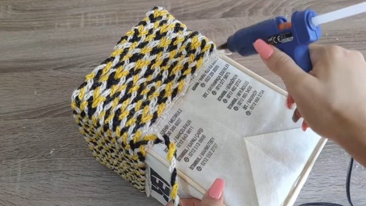 Обмотайте короб нитяной косой, закрепляя её с помощью клеевого пистолета.