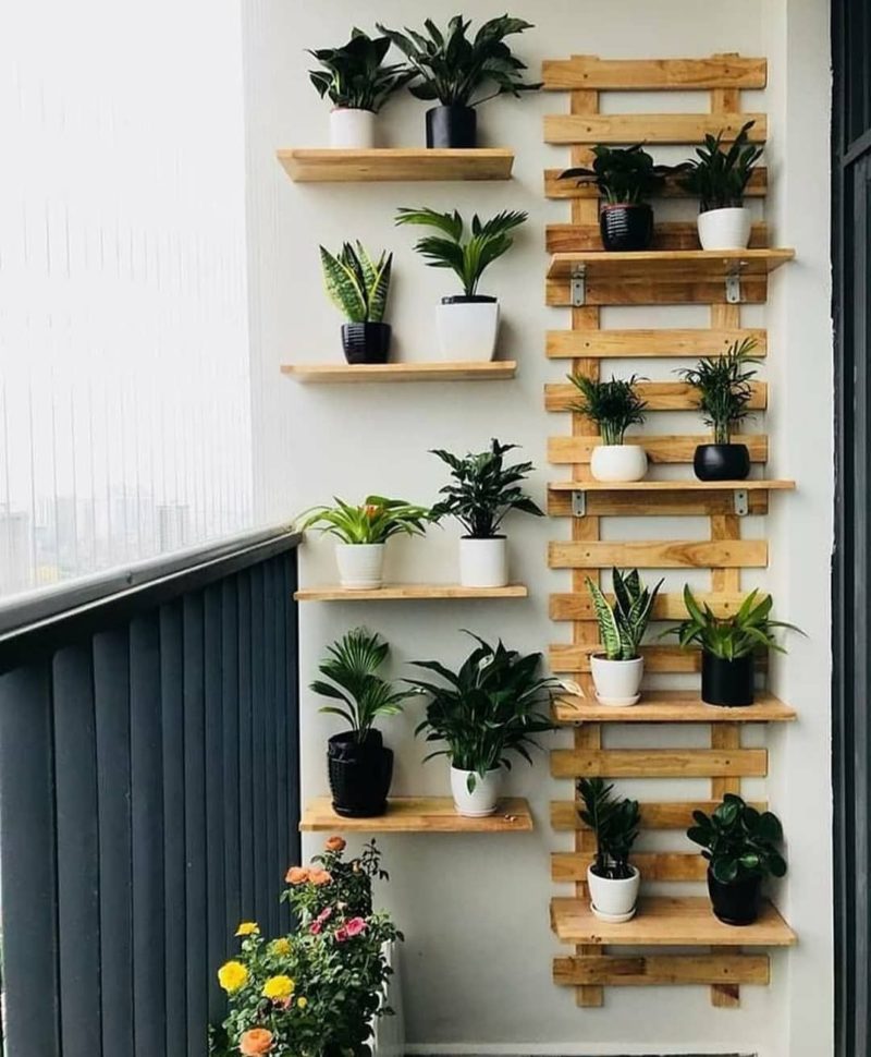 Решётка с полками на балконе — это отличная идея разместить все свои многочисленные горшки с цветами, освободив, наконец, подоконник.