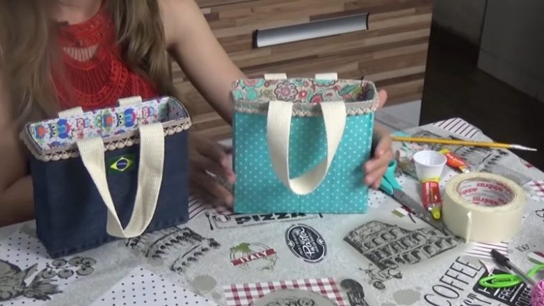 Таким образом можно делать подарочные пакеты с использованием любой ткани, в том числе, из ненужных джинсов.
