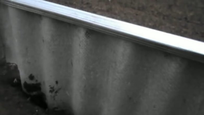 Между столбами хозяин установил шифер в землю, на который закрепил профиль.