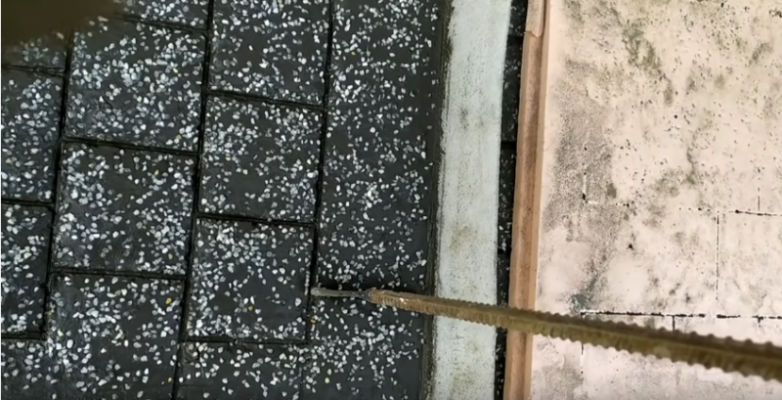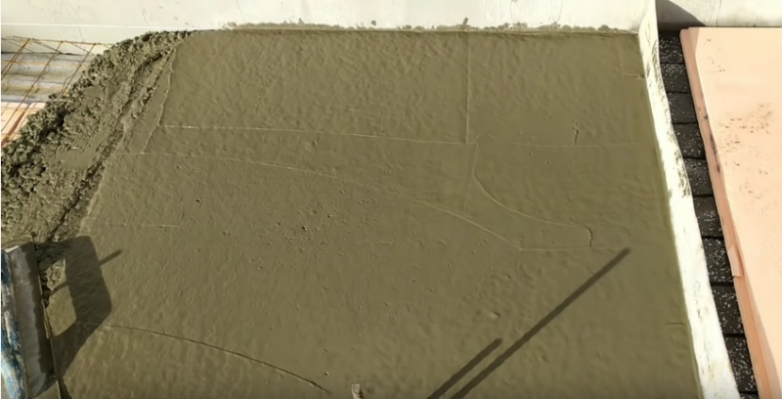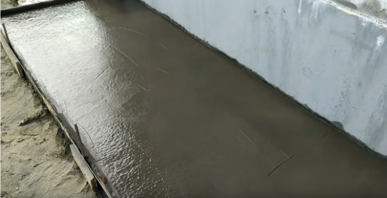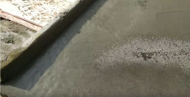 Далее подготавливаем рабочий раствор, исходя из соотношения: 1 часть цемента: 2,5 части песка: 4 части щебня. Раствор должен получиться достаточно густым, поэтому воду стоит добавлять постепенно. Получившимся составом заливаем поверхность, хорошо его разравнивая. Оставляем состав до момента, когда на его поверхности выступит лишняя влага.