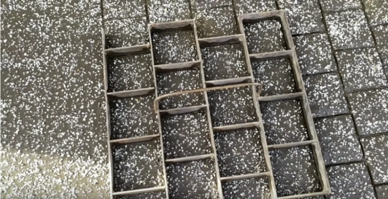Даем верхнему слою подсохнуть еще примерно 1 час, спустя это время его консистенция будет напоминать сливочное масло. В этот момент можно переходить к штамповке. Для этого будем использовать вот такой сваренный из стальной полосы штамп. Рисунок может быть любым, в нашем случае это квадраты.