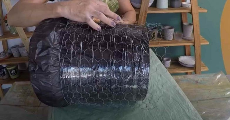 Отрезаем кусок нужного размера, и оборачиваем вокруг ведра. С помощью металлической проволоки фиксируем края сетки.