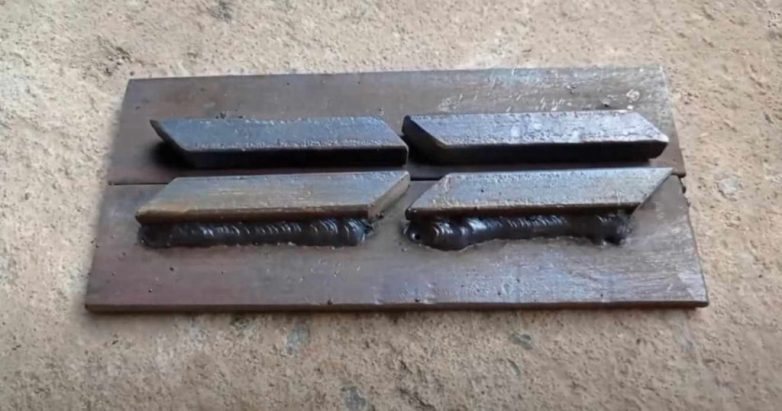 На следующем этапе отрезаем четыре заготовки из стального квадратного прутка, и привариваем их к основанию.