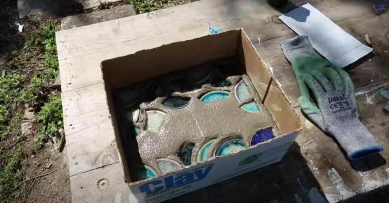 А вот в качестве украшения можно использовать цветное битое стекло (подойдут пустые бутылки из-под вина, шампанского, пива) или осколки от керамической посуды с глянцевым покрытием.