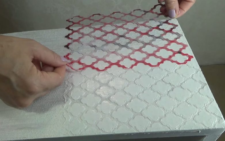 После того как поверхности высохнут, прибейте на гвозди заднюю стенку. На внешнюю поверхность тумбы нанесите два слоя адгезионного грунта. После полного высыхания второго слоя грунта можно переходить к оформлению тумбы. Быстро справиться с задачей и получить отличный результат поможет трафарет. Нанесите рисунок на тумбу через трафарет с помощью шпаклевки.