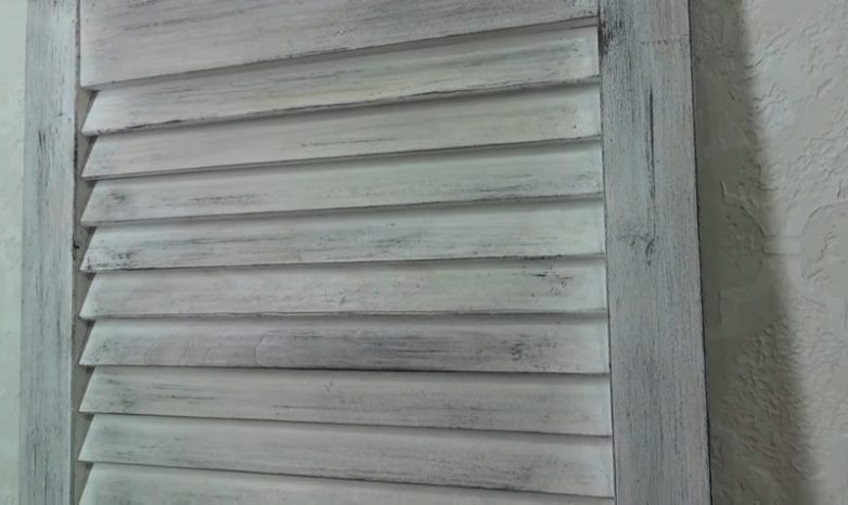 В качестве дверцы будущей тумбы отлично подойдет жалюзийная дверца. Покрасьте ее акриловой краской. Для придания интересного эффекта добавьте несколько штрихов с помощью практически сухой кисти с твердой щетиной и черной акриловой краски.