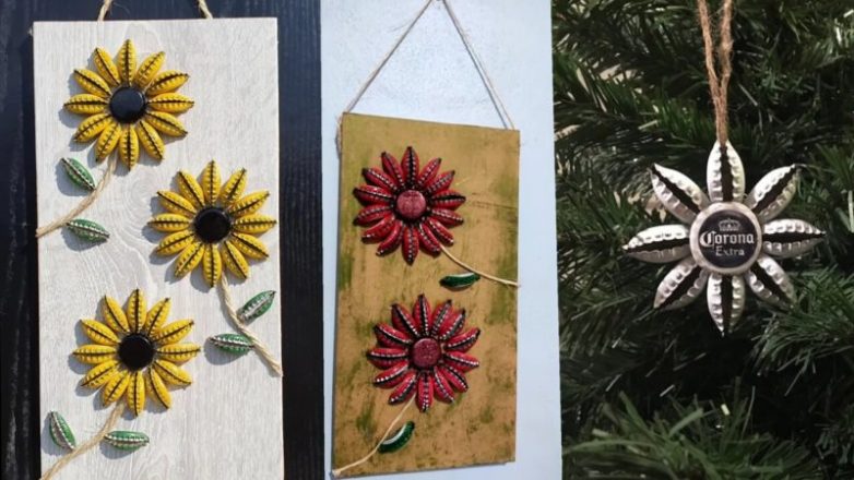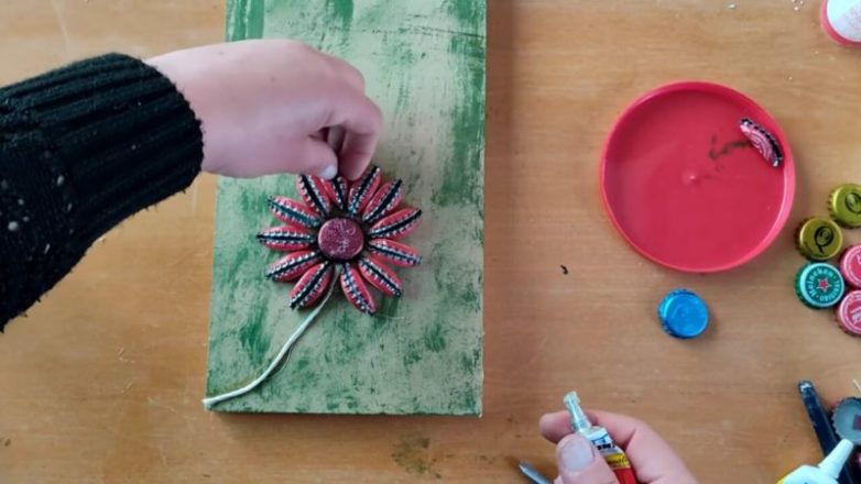 Для последней идеи также приготовьте доску, которую покрасьте в желаемый цвет. К доске приклейте кусочек пряжи, или верёвки, или джута. Далее приклейте согнутые пополам бутылочные крышки вокруг одной не согнутой, как цветок.