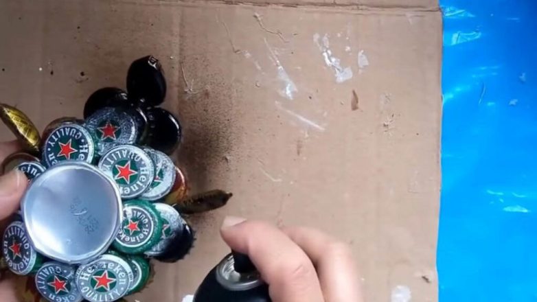 Для второй идеи плотную, плоскую пластиковую тарелку оклейте бумагой и клеем ПВА, покрасьте. Дно полностью заполните бутылочными крышками.