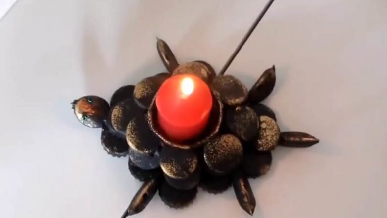 Для четвёртой идеи склейте крышки в несколько рядов, стараясь изобразить черепашку. Ноги черепахи сделайте из согнутых пополам бутылочных крышек. В центр вклейте дно от алюминиевой банки. Всё покрасьте аэрозольной краской.