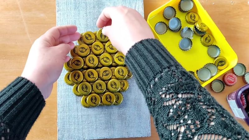 На доску приклейте крышки жёлтого цвета (можно заранее покрасить краской) в форме овала, в два ряда, для 3D-эффекта. Сверху приклейте крышки, согнутые пополам. Покрасьте их в зелёный цвет.
