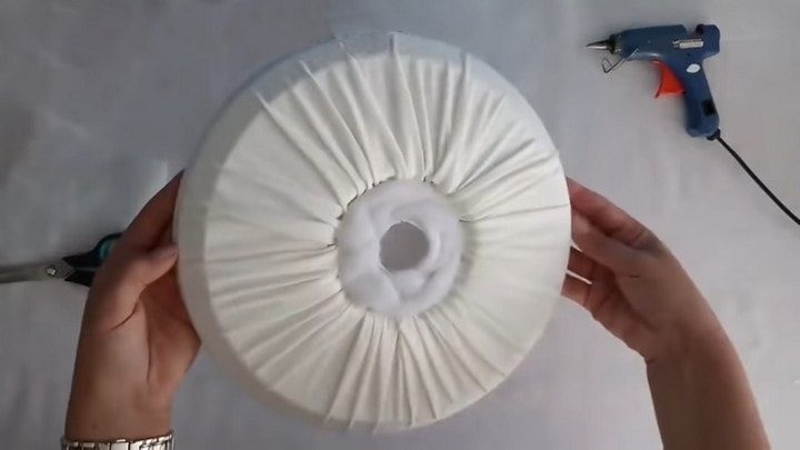 Теперь берём кусок эластичной ткани и клеевой пистолет. Закладывая равномерные складки и, немного натягивая, клеим материю вокруг центрального отверстия. Излишки обрезаем.