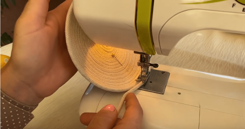 Когда дно готово, можно переходить и к стенкам корзинки. Для этого поднимаем получившееся к этому моменту дно на 90 градусов по отношению к машинке и продолжаем прошивать ряд за рядом, но теперь уже в другой, перпендикулярной по отношению ко дну плоскости.