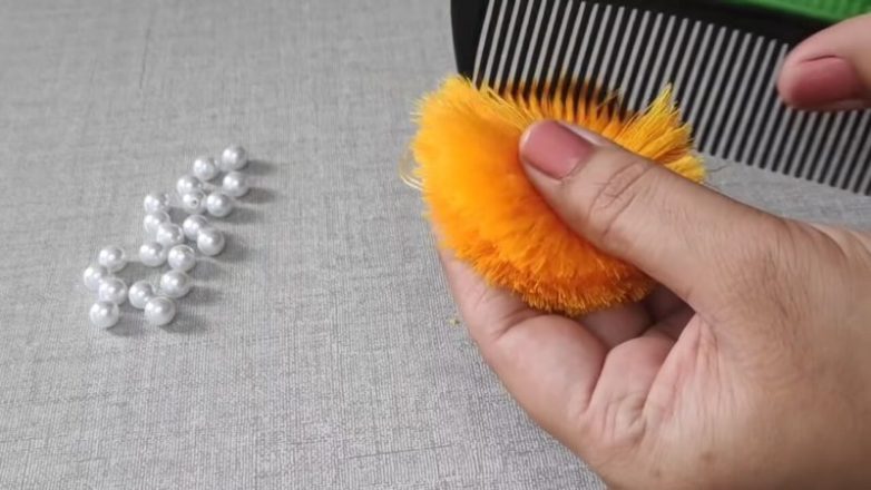 Приплющите две половинки вместе. Разгладьте нитки расчёской. Подровняйте край ножницами.