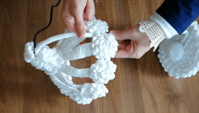 Переходим к сборке абажура. Сначала дополняем каждый лепесток маленьким кругом. Из жесткой проволоки делаем круг, дополняем его оплеткой. Величина круга может быть разной: чем меньше круг, тем более шаровидным будет абажур. Помещаем круг изнутри у основания и приклеиваем к нему каждый цветок. Сверху дополняем абажур обмоткой из шнура с буклями, оставив небольшое отверстие для шнура.